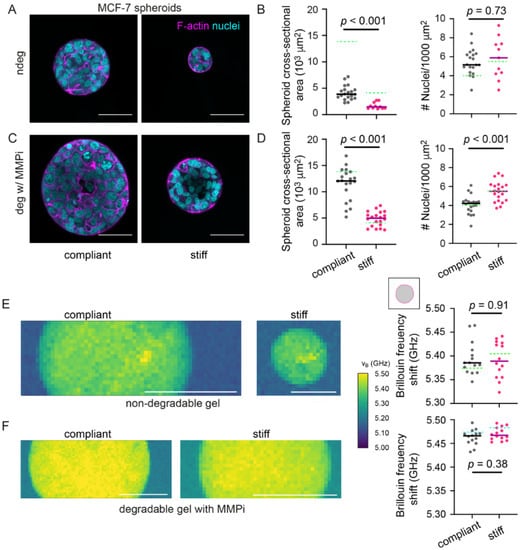 Figure 3. Blocking hydrogel degradation causes similar Brillouin frequency shifts between spheroids in compliant and stiff hydrogels. (A) Representative confocal microscopy images of MCF-7 spheroids grown in non-degradable compliant and stiff hydrogels. Spheroid cultures were stained for F-actin and nuclei using Phalloidin-TRITC and DAPI respectively. (B) Cross-sectional area and number density of cells per unit area of MCF-7 spheroids in compliant and stiff non-degradable gels. n = 10–20 spheroids each. (C) Representative confocal microscopy images of MCF-7 spheroids formed in a compliant and stiff degradable gel treated with 20 µM MMPi (D) Cross-sectional area and number density of cells per unit area of MCF-7 spheroids grown in compliant and stiff degradable gels treated with MMPi. n = 20 spheroids each. (E) Representative Brillouin maps of MCF-7 spheroids formed in a compliant and stiff non-degradable gel. Right: Scatter plot showing Brillouin frequency shifts for MCF-7 spheroids in compliant and stiff non-degradable gels. n = 14–15 spheroids each. Solid lines indicate medians. (F) Representative Brillouin maps of MCF-7 spheroids formed in a compliant and stiff degradable gel treated with MMPi. Right: Scatter plots showing Brillouin frequency shifts for MCF-7 spheroids in compliant and stiff degradable gels treated with MMPi. n = 14 spheroids each. Solid lines indicate medians. Dotted green and turquoise lines indicate medians of MCF-7 spheroids in (B,E) degradable gels or in (D,F) degradable gels treated with DMSO (vehicle control), respectively. A Mann–Whitney test was done for statistical analysis. p-values are given. All spheroids were analyzed after 14 days of culture. All scale bars correspond to 50 µm.