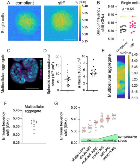 Figure 4. Brillouin frequency shifts increase with compressive stress. (A) Representative Brillouin maps of single MCF-7 cells grown in non-degradable compliant and stiff hydrogels at culture day 1. Scale bar corresponds to 10 µm. (B) Scatter plot showing corresponding Brillouin frequency shifts. n = 10. Solid lines indicate medians. Dotted green lines indicate medians of MCF-7 spheroids in non-degradable gels. A Mann–Whitney test was done for statistical analysis. p-values are given. (C) Representative confocal microscopy image of multicellular aggregates (not embedded within hydrogels) formed by MCF-7 cells 48 h after assembly. F-actin and nuclei were visualized using Phalloidin-TRITC and DAPI, respectively. Scale bar corresponds to 50 µm. (D) Cross-sectional area and number density of cells per unit area of multicellular MCF-7 aggregates. n = 20 spheroids. (E) Representative Brillouin map of multicellular aggregates as in C. (F) Scatter plot showing corresponding median Brillouin frequency shifts take from maps of multicellular aggregates as in E. n = 10. Line indicates median. Scale bar corresponds to 20 µm. (G) Median Brillouin frequency shifts obtained from a comparable set of experiments. For the different conditions, different levels of compressive stress level are expected as indicated by green bars, from single cells and free-floating multicellular aggregates to compliant and stiff degradable and non-degradable hydrogel cultures.