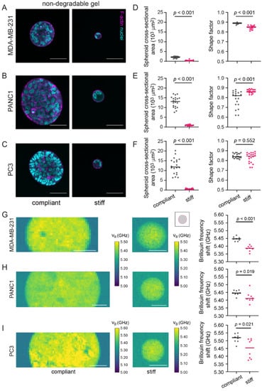 After exploring the effect of microenvironment stiffness and degradability on spheroids from non-invasive MCF-7 cells, we wondered how invasive cell behavior would be coupled to microenvironment and spheroid mechanics. Thus, we embedded MDA-MB-231 (basal breast cancer cell line), PANC1 (pancreatic cancer cell line) and PC3 (prostate cancer cell line) in compliant and stiff non-degradable gels (Figure 5A–C), all of which are invasive cancer cell lines. In contrast to MCF-7 cells, the panel of invasive cell lines failed to form proper multicellular spheroids within stiff non-degradable hydrogels. Only small aggregates consisting of about 2–3 cells per cross-section were observed. In compliant hydrogels, multicellular spheroids formed for all cell lines, although considerable size variations were seen, especially for PANC1 and PC3 cells (Figure 5D–F). While cell density increased for MDA-MB-231 cells in stiff hydrogels, for PC-3 and PANC1 decreased values were seen (Figure S6). Overly, shapes were—as expected due to the lack of hydrogel degradability—rather round as indicated by the shape factors (>0.8) and no invasive events were seen (Figure 5D–F). In contrast to MCF-7 spheroids in non-degradable hydrogels, we observed that the Brillouin frequency shifts for the MDA-MB-231, PANC1 and PC3 cells growing in a stiff gel were lower compared to spheroids in compliant hydrogels (Figure 5G–I). Since we had quantified that all three cell lines only formed very small clusters or even remained as single cells in stiff hydrogels, the relatively low Brillouin frequency shifts in stiff versus compliant hydrogels may be attributed to the lower levels of compressive stress, analogously to what we had observed for single MCF-7 cells (Figure 4).