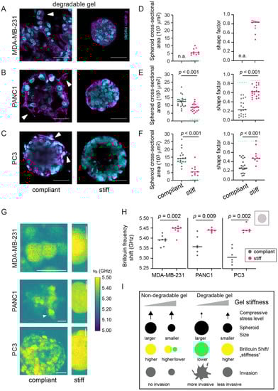 Figure 6. Invasive cancer cell lines (MDA-MB-231, PANC1 and PC3) show lower Brillouin frequency shift and invade into compliant degradable hydrogels. (AC) Representative confocal microscopy images of MDA-MB-231 (A), PANC1 (B) and PC3 (C) spheroids grown in a compliant and stiff degradable gel. Scale bars correspond to 50 µm. (DF): Scatter plots showing cross-sectional area and number density of cells per unit area of respective spheroids in compliant and stiff degradable gels. n = 20 spheroids each. Solid lines indicate medians. Dotted green lines indicate medians of respective spheroids in non-degradable gels. (G) Representative Brillouin maps of MDA-MB-231, PANC1 and PC3 spheroids formed in a compliant and stiff degradable gel. Scale bars correspond to 25 µm. (H) Scatter plots showing Brillouin frequency shifts for respective cell types. Lines indicate medians. n = 6–8 spheroids each. A Mann–Whitney test was done for statistical analysis. p-values are given. Spheroids analyzed after 14 days of culture. (I) Summary of results on compressive stress, spheroid growth, mechanics and invasion in dependence of matrix degradability and stiffness.