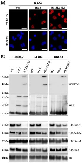 Validation and epigenetic characterization of the H3.3K27M-engineered cell models. (a). Microscopy pictures of the Res259 cell line, WT cells or cells expressing the H3F3A mutated (H3.3K27M) or unmutated (H3.3) gene. Fluorescence was acquired for the mCherry signal (top lane) or Hoechst signal (bottom lane). Scale bars 10 µm. (b). Western blot of H3K27M and H3.3 was performed on all cell lines. Other epigenetic marks were also evaluated as H3K27me3/me2/me1 and H3K27ac. H4 was used as a loading control.