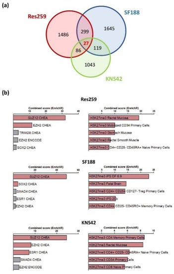 Transcriptomic reprogramming of K27M-expressing glioma cells. (a). Venn diagram representation of genes whose expression was changed by more than 2-folds in each H3.3K27M vs. control cell line. (b). Bar-graphs obtained via an EnrichR analysis, showing that genes whose expression is changed in each cell line correspond significantly to H3K27me binding regions, defined by Chip-seq analyses in the framework of the ENCODE and ChEA Consensus TFs from ChIP-X (left panel) and Epigenomics Roadmap HM ChIP-seq (right panel) (red bar show significant p-value).