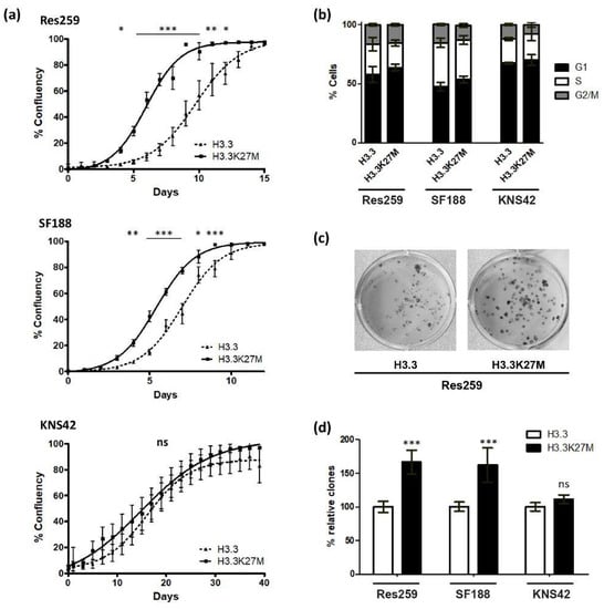 Effects of H3.3K27M induction on cell growth and clonogenic properties. (a) Confluency was measured every day using Incucyte. Cell growth curves give the % of confluency as a function of time in days. The assay was conducted in sextuplicate and repeated 3 times. Error bars represent ± SD of sextuplicates. Statistical significance was calculated with an Anova test (*** p < 0.001; ** p < 0.01; * p < 0.05; ns—non-significant) (dark line and squares: H3.3K27M; dotted dark line and triangles: H3.3). (b) Cell cycle distribution measured by flow cytometry using Vybrant™ DyeCycle™ Violet Stain. (c) Pictures of colonies formed by Res259-H3.3 and -H3.3K27M cells 10 days after seeding at low density. (d) Percentage of formed colonies normalized to H3.3 condition in each cell line. The experiment was realized in quadruplicate and repeated 3 times. Error bars represents ± SD of quadruplicates. Significance was evaluated using an Anova test. (*** p < 0.001, ns—non-significant).
