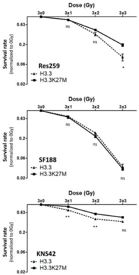 Effect of H3.3K27M induction on cell response to irradiations. The impact of H3.3K27M on cell resistance to ionizing radiations was determined by clonogenic assay. Cells were irradiated with fractions of 0, 1, 2 or 3 Grays per day for 3 consecutive days. After 10 days, colonies were counted. The survival rate (or fraction) is defined as the following ratio: (number of colonies after irradiation/(Plating Efficiency × number of seeded cells)). Results are representative of 3 independent experiments. ** p < 0.01; * p < 0.05; ns—non-significant.