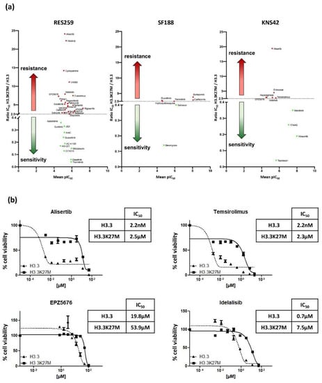 Impact of H3.3K27M on pediatric glioma cell response to a library of antitumoral drugs. (a) A library of 80 compounds was tested, each one at 4 different concentrations. Cells were seeded and incubated with compounds for 72 h. The ratio of H3.3K27M/H3.3 IC50 was calculated and reported. Red dots represent a ratio > 2.5 between H3.3K27M and H3.3, i.e., chemoresistance linked to the mutation. Green dots represent a ratio < 0.4, reflecting a chemo-sensitivity conferred by the mutation. (b) Res 259 cells were incubated and drugs were added 24 h after incubation. % of viability, relative to the condition 1% DMSO defined as 100% (control), was measured by CellTiter-Glo luminescent assay, 72 h after treatment. The IC50 values indicated in the tables were determined by fitting the survival curves. (H3.3 dotted dark line; H3.3K27M dark line).