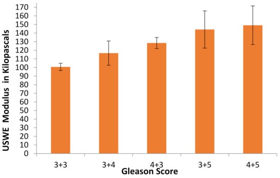 Bar chart of the Gleason score and USWE modulus in 30 patients with prostate cancer (the bar is the mean modulus in each Gleason score category with standard deviation sitting on the top of the bar), (rs = 0.67, p < 0.001, n = 30).