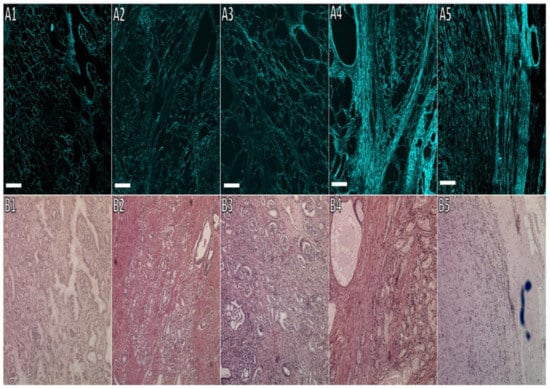 Prostate cancer sections with different Gleason scores. (A1–A5) SHG images, and (B1–B5) H&E images. In specimens with prostate cancer GS 3 + 3 (1), the SHG signals in prostate cancer were surrounding the glands with more closed margins; however, these became fainter and partially lost in GS 3 + 4 (2) and 4 + 3 (3). As the cancer is more aggressive GS (3 + 5 (4) and 4 + 5 (5)), the cancer cells fill the gland, and some spread to the stroma. In GS 4 + 5, the glands are fused, and there are only sheets of cancer cells left with no glandular shape. The scale bar is 300 μm, and the microscope magnification is 100×.