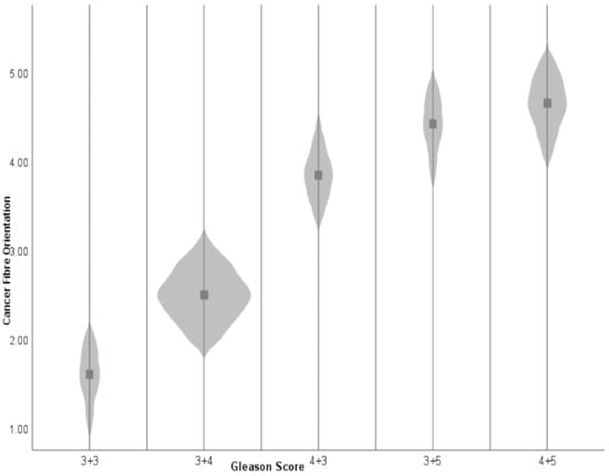 Violin Plot showing data distribution between cancer fibre orientation and Gleason score groups (grey rectangular sport in each violin is the mean of each group).