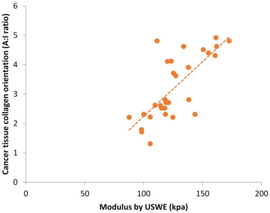 Scatter plot of the USWE modulus and SHG collagen orientation in 30 patients with prostate cancer (r = 0.74, p < 0.001, n = 30).