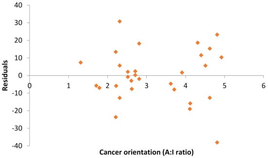 In order to measure how well the line fits the data, residuals were calculated and plotted against the explanatory variable, which is the A:I ratio (Figure 6). The plot showed no systematic curvature nor major outliers, which indicated it was a reasonable residual plot and therefore the line fits the data well.