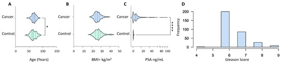Figure 1. Demographic and clinical characteristics of PCa patients (n = 373) and healthy male volunteers (n = 134) used for spectral library generation. (A) Age distribution; (B) body mass index; (C) prostate-specific antigen (in ng/mL); and (D) Gleason score frequency distribution. All characteristics were captured at the time of sample collection. Statistical significance was determined by a non-parametric Mann–Witney test. p value shown as: 0.01–0.05 (*) and <0.001 (****).