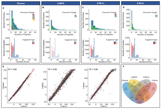 Figure 2. Overview of PCa spectral libraries generated in silico and built in-house. Frequency distribution of peptides per protein and ion per peptides of (A) in silico library (Disease); (B) in-house library built on Orbitrap Fusion Lumos Tribrid Thermo Scientific (Waltham, MA, USA) mass spectrometer (in micro-flow mode); (C) in-house library built on Sciex TripleTOF 6600 mass spectrometer (in micro-flow mode, S-Micro); (D) in-house library built on Sciex TripleTOF 6600 mass spectrometer (in nano-flow mode, S-Nano); (E) retention time (RT) correlation between the four libraries by using S-micro as a base library; (F) Venn diagram presenting the proteotypic proteins overlap between the four libraries.