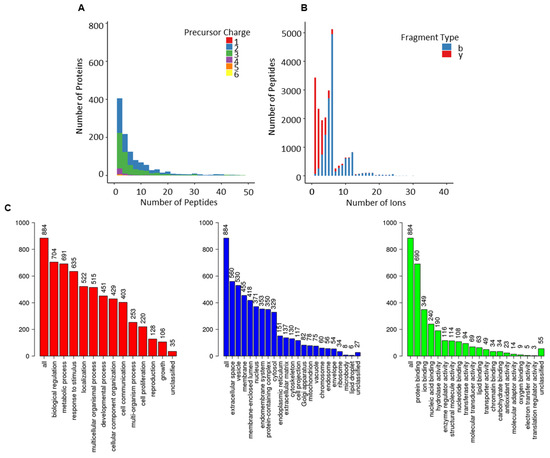 Figure 3. Overview of combined-PCa serum spectral library. (A) Frequency distribution of peptides per protein; (B) ion per peptides; (C) gene ontological analyses of the proteotypic proteins from combined-PCa library mapped using the WebGestalt Webserver. The biological processes, cellular processes and molecular function categories are shown, where the height of each bar represents the percentage of mapped IDs per category.