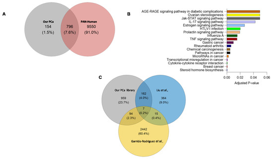 Figure 4. (A) Overlap between proteotypic proteins in the combined-PCa and Pan-Human spectral libraries. (B) KEGG pathway analysis of proteins unique to combined-PCa spectral library. (C) Overlap of the total protein count of our combined serum PCa spectral library and PCa spectral libraries previously published from PCa tissue and cell lines samples [19,20].