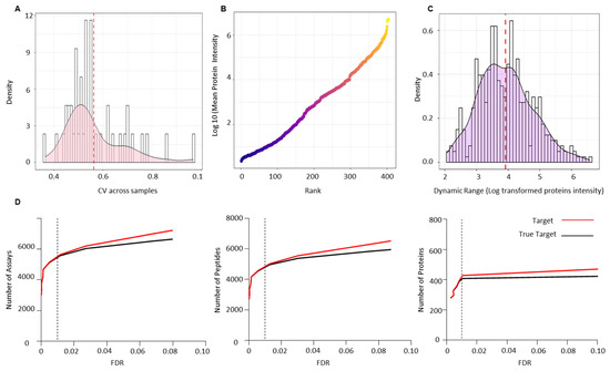 Raw data files from the validation cohort were analysed against the combined-PCa serum spectral library. CV was calculated to assess the technical variation across all biological samples used for validation and was found to be less than 10, which is consistent with the possibility of technical variation (Figure 5A). One of the most challenging issues in quantifying the serum proteome is the dynamic range of proteins present, which makes measurement difficult. Since the serum proteome is usually occupied by highly abundant proteins, measuring low abundance proteins is difficult. Immune depletion of the key abundant proteins is one approach to addressing this issue. We report the dynamic range of the PCa serum proteome after depleting the 12 most abundant proteins and ranking all 404 identified proteins in the validation cohort by their log mean intensity based on their abundance (Figure 5B). The PCa proteome is six orders of magnitude higher than the typical dynamic range of serum or plasma reported in the literature (this lies within 2–4 log range). The dynamic ranges of individual proteins detected in the PCa serum validation cohort were then calculated using the ratio of the maximum and minimum log10 protein intensities (Figure 5C). The identified proteins had dynamic range values ranging from 2.07 to 6.57 (SD = 0.85) orders of magnitude. True targets were estimated using a target-decoy approach, which identified 5572 transitions, 4953 peptides, and 404 proteins with an FDR of 1% (Figure 5D) (Table S7). Table S8 shows the sum of transitions, peptides, and proteins across each sample from the validation cohort.