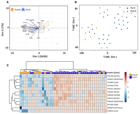 Figure 6. Usability of the combined PCa serum library. (A) PCA showing separation between pre- and post-radiotherapy samples of validation cohort after feature selection by random forest. (B) t-SNE plot showing separation between pre- and post-radiotherapy samples in the validation cohort after feature selection by random forest. (C) Heatmap showing the clustering of pre- and post-radiotherapy samples based on significant (p value ≤ 0.05) and non-variable proteins. Each coloured cell on the map represents a data point’s concentration value, with samples arranged in rows and features arranged in columns. Distance was calculated using the “Euclidean” approach, while clustering was performed using the “ward” method. The Uniprot accession number of each given protein are as follows: APOM (O95445), TTR (P02766), APOH (P02749), SAA4 (P35542), CA1 (P00915), ITGB3 (P05106), SERPINA6 (P08185), BCHE (P06276), SERPINA4 (P29622), C8B (P07358), LUM (P51884), CRTAC1 (Q9NQ79), AZGP1 (P25311), FN1 (P02751), ENO2 (P09104), MINPP1 (Q9UNW1) and BTD (P43251).