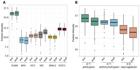 The KLKB1 gene codes for the production of a protein known as pre-kallikrein that is produced in the liver and circulates in the blood and is involved in blood clotting [40]. MYC mRNA and protein overexpression in PCa tumour foci corresponds with disease severity [37]. IGF1, a downstream MAPK and PI3K receptor, boosts their signalling and promotes the formation of PCa [41]. The recurrence of castration-resistant PCa is influenced by androgen receptor signalling [42]. BRCA genes have been linked to breast and ovarian cancer. They also raise the risk factors for aggressive PCa in men because cells are less capable of repairing DNA damage without BRCA genes, making them more vulnerable to tumour formation [43]. Similarly, STAT3 and its upstream activator, the IL6 receptor, have been linked to PCa development and may represent future therapeutic targets [44]. We confirmed the expression of PCa-related proteins across SWATH maps of validation cohort samples to establish the utility of our reference library for biomarker research (Figure 7A). PSA enters the bloodstream free or bound to one of three serum proteins: α-2 macroglobulin, α-1-antichymotrypsin and α-1antitrypsin. PSA appears to be abundant in bound form in PCa males, indicating that PCa cancer cells produce more of these binding proteins [45]. We validated that they were included in the PCa validation set (Figure 7B).