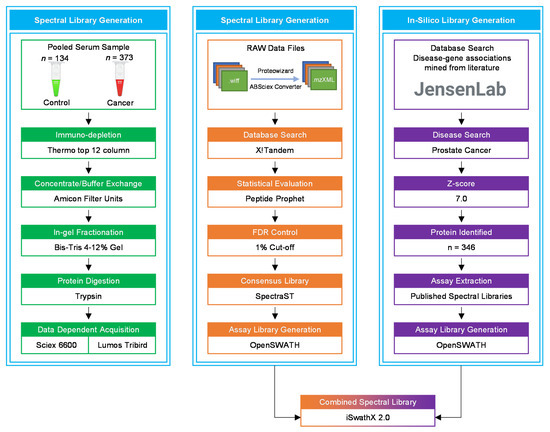 Figure 8. A flowchart of the data acquisition and spectral library generation workflow. The pooled samples were immuno-depleted of the top 12 abundant proteins, followed by protein concentration, in-gel fractionation, and in-gel tryptic digestion. All samples were analysed using LC-MS/MS for data dependent acquisition (DDA). In the OpenSWATH library generation pipeline, X!Tandem was utilised for database search of raw MS files. The in silico library was created by extracting PCa-related proteins from the Disease database using a z-score cut-off of 5.0. iSwathX, a web-based tool, was used to merge all four assay libraries.