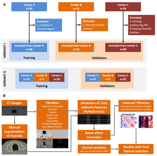 The studied cohort was a subgroup of patients included in previous study on validation of NTCP models for radiation-induced hypothyroidism by Nowicka et al. [7], recruited between 1 May 2016 and 31 December 2018 and followed up until February 2020. In addition to already collected clinical data, for this study we retrieved CT images from radiotherapy planning with thyroid glands retrospectively contoured by two experienced radiation oncologists according to the guidelines for organs at risk (OARs), as described previously. Patients for whom the CT image was unavailable, thyroid contour was missing or thyroid region contained CT artifacts, were excluded. Finally, among 108 patients recruited in 3 centers 98 had complete data and were included in this study (38 from center A-Copernicus Regional Specialist Hospital in Lodz, Poland; 12 from center B-Radom Oncology Center and Maria Sklodowska-Curie National Research Institute of Oncology, Radom, Poland and 48 from center C-Radiotherapy Department, Maria Sklodowska-Curie National Research Institute of Oncology —branch in Gliwice, Poland); selection of cases is summarized in Figure 1A.