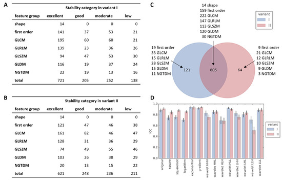 Results of feature stability assessment. Number of features in each group classified to different stability categories for variant I (A) and II (B). Overlap of features with at least good stability between variant I and II (C). Average stability of all radiomic features with respect to applied image filter (D, shown mean with 95% confidence interval).