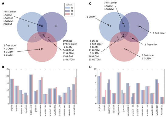 Before filtration, features were scaled, normalized (Figure S1) and in variant Ib batch effect was corrected (Figure S2). First stage of filtration consisted of exclusion of features that in univariate analysis did not differentiate patients who did or did not develop RIHT (detailed results of this analysis in Table S5). It resulted in selection of 165 radiomic features in variant I and 166 in variant II, among which 153 were common to both variants (Figure 3A). Having a limited number of patients, we decided to reduce these numbers further before model development by elimination of highly correlated features. Selection of representatives from each group of such related variables left 67 features in variant Ia, 68 in variant Ib and 66 in variant II (lists of features in Table S6). Again, the overlap between variants, consisting of 61 radiomic features, greatly outnumbered distinct variables for each variant (Figure 3C). At both stages of filtration, features from original image and the one with exponential filter applied were preferred over other groups (Figure 3B,D).