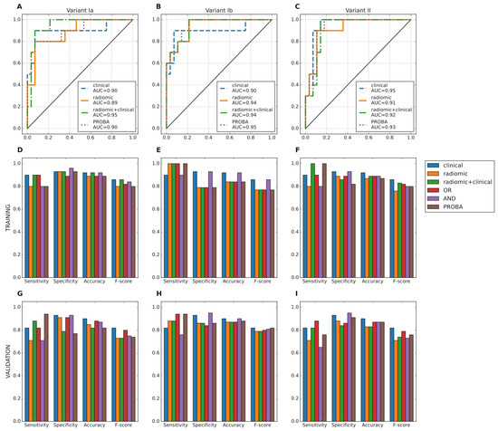 AUC ROC of the selected models (clinical, radiomic, radiomic+clinical) and their ensembles for the training set (A–C). Comparison of statistical measures for the selected model architectures of the considered feature sets and ensembles of those models: training (D–F) and validation (G–I).