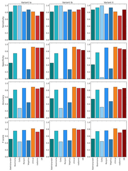 In all variants of analysis, radiomic models performed similarly to clinical models (Figure 4A–C); comparisons of ROC AUC by DeLong test never showed superiority of models using radiomic features vs clinical/dosimetric model (Table 3). Slight improvement of radiomic models is observed after batch effect correction (variant Ib). The statistical measures (sensitivity, specificity, accuracy and f-score) for each of the selected models and the ensembles of clinical and radiomic models were calculated (Figure 4D–I). Radiomic+clinical model was not included in ensembles, because it contained a very similar feature set to radiomic and clinical models taken together. Based on those measures, we picked clinical, radiomic and OR models for the comparison with the external NTCP models for radiation-induced hypothyroidism [8,9,37,38,39].