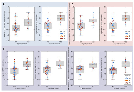 Image processing and radiomic feature extraction were performed with PyRadiomics v3.0 [31]. Due to diversity of pixel spacing and slice thicknesses, all images and thyroid masks (generated from contours using dcmrtstruct2nii library [32]) were resampled to 1 × 1 × 1 mm3 isotropic voxels. Default PyRadiomics interpolators were used in resampling: nearest neighbor interpolation for binary thyroid mask and B-spline interpolation for CT image. At the same time, both image and mask were cropped to thyroid bounding box with 10 mm padding added to ROI bounding box at each side; the operation is done by default by PyRadiomics during resampling, but we increased default padding size from 5 to 10 voxels. Then, radiomic features were calculated that in the applied version of the library included: 14 shape features, 18 first order statistics, 24 gray level cooccurrence matrix-based (GLCM) features, 16 gray level run length matrix-based (GLRLM) features, 16 gray level size zone matrix-based (GLSZM) features, 5 neighborhood gray tone difference matrix-based (NGTDM) features, 14 gray level dependence matrix-based (GLDM) features (full list of features in Appendix A). Radiomic features were extracted from original images and from their filtered versions, applying all filters available in PyRadiomics feature extractor: square, square root, logarithm, gradient, exponential and 8 wavelet decomposition filters. Default values of PyRadiomics feature extractor settings were used, including filtration parameters. Resegmentation was not applied. In total, 1316 features were calculated for each image (14 shapes features extracted from image mask, 93 intensity-based features for original images and 13 filtered ones).
