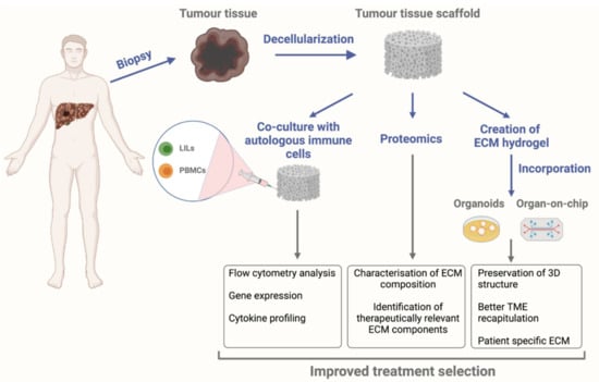 An example of a personalised bioengineered model that could be used to determine the best course of treatment for patients. In this model, we envisage that a tissue sample from the tumour site can be obtained using biopsy after which acellular scaffolds can be generated using decellularization. These tissue scaffolds can then have various applications including co-culture with autologous immune cells, analysis of composition with proteomics, or can be a source material for ECM hydrogels used in 3D disease models. LILs: liver infiltrating lymphocytes, PBMCs: peripheral blood mononuclear cells. The figure was created using BioRender (https://app.biorender.com, accessed 4 November 2021).