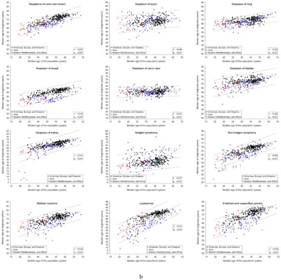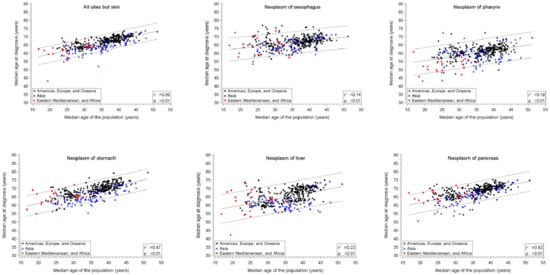 The first approach used in this study was a cross-sectional analysis. We visualized and quantified the association between the median age at cancer diagnosis and the median age of the corresponding population by including the 393 unique populations recorded in the XI volume (representing nearly one sixth of the world population located in 65 countries). CRs operating in low- and middle-income settings may face particular challenges in following international registration standards such as a lack of coverage by pathology laboratories or difficulty in accessing diagnosis records, which reduce the percentage of microscopically verified cases [11]. Similarly to our previous paper on BC [7], CRs were further analyzed by a priori selected geographical areas (Americas, Europe and Oceania, 285 CRs; Asia, 84 CRs; and Eastern Mediterranean and Africa, 24 CRs) as a geographic sensitivity analysis. In particular, for each cancer or group of cancers, the shape of the association between median age at cancer onset and age of the population was investigated by means of scatterplots. After visualizing the scatterplots, we assumed that the shape between the two groups of medians was linear. All statistical analyses were carried out by means of SAS (version 9.4 SAS Institute, Cary, NC, USA) using proc reg that produces by default a variety of diagnostic plots of the residuals versus the regressor. For instance, when considering all 393 CRs, in any cancer or group of cancers studied, the plots of residuals and studentized residuals versus the predicted values exhibited no specific pattern that contrasted the linear relationship hypothesized visually by examining the scatterplots. Moreover, the points of the plot of the dependent variable versus the predicted values lay along a 45-degree line, indicating that the model predicted the behavior of the median age at cancer onset variables. Thus, after examining the diagnostic plots, the analyses were considered acceptable to conclude in the linearity of the relationship studied. The strength of the association was measured by means of a simple linear regression model of the least square method. In the model, the median age of the population was the predictor variable while the median age at cancer onset was the dependent variable. The slope of the regression line measured the variation of the age at cancer onset corresponding to a one-year increase of the median age of the population. The percent of the variation of the median age at cancer onset that is explained through the linear relationship by the population ageing was quantified by means of a r2. Finally, an overall F-test verified if the r2 value was significantly different from zero. Linear regression models including all available CRs were calculated separately for the two IARC volumes. The linear slope and r2 was considered as statistically significant with a p-value < 0.05. We added the 95% predictive intervals to the scatterplots to display the range of values within which the median age at cancer onset was likely to fall given the median age of the underlying population in order to further check their linear relationship.