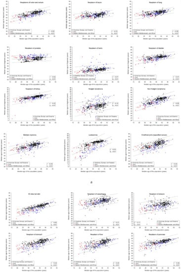 The median age at cancer onset varies worldwide across populations [1,2]. For instance, it has been observed that the median age at onset of female breast cancer (BC) was a decade higher in high income countries than in low/middle income countries (LMIC). This observation suggested lowering the age of entry into mass BC screening programs in LMIC [3]. However, the variation in median age at cancer onset is intuitively linked to the age composition of the underlying populations, like for many forms of cancer, age-specific incidence rates increase exponentially with ageing [4,5]. The strength and the shape of the association of the age at cancer onset with the age structure of the corresponding population has been described thoroughly only for BC [6,7]. Specifically, each one-year increase in median population ageing is linearly associated with a nearly ½ year increase of median age at BC onset with an explained 42% variance [7]. Thus, once the median age of a population is known, it is possible to estimate the median population age at BC onset. However, there is not much evidence to what amount age explains this association in other cancer sites or the shape of this association. The knowledge of this quantity may help interpreting high frequencies of cancer onset in specific age groups worldwide.