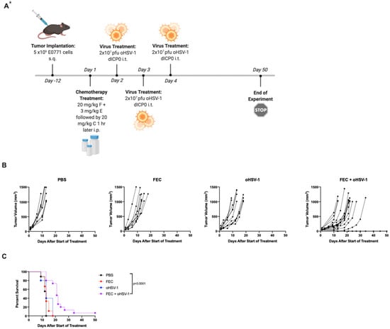 A combination of clinical chemotherapy and oncolytic HSV-1 synergizes for improved disease control in E0771 tumors; (A) C57/Bl6 mice bearing E0771 tumors on the left flank were treated with PBS (n = 9), chemotherapy (FEC, n = 9), oncolytic virus (oHSV-1, n = 9), or chemotherapy + oncolytic virus (FEC + oHSV-1, n = 14). * Created using BioRender.com. (B) Tumor volumes were measured every 2–3 days from the start of treatment until mice reached tumor endpoint (volume = 1000 mm3). Each line represents an individual mouse within the group. (C) Kaplan–Meier survival curves of each group. * Mantel–Cox test was used for statistical analyses.
