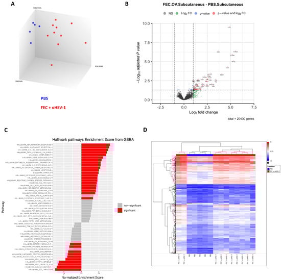FEC + oHSV-1 therapy upregulates many immune pathways and processes associated with myeloid cells in subcutaneous E0771 tumors; C57/Bl6 mice bearing E0771 subcutaneous tumors were treated with either PBS or FEC + oHSV-1. Tumors were harvested on day 5, and RNA was extracted from whole tumor digests and sent for Clariom analysis. (A) A 3-D cluster plot showing the RNA expression correlations between mice treated with PBS (blue; n = 5) and FEC + oHSV-1 (red; n = 10). (B) Volcano plot showing differentially expressed genes between tumors treated with FEC + oHSV-1 and PBS. (C) Heat map showing the normalized expression values of genes across all samples. (D) Bar plot illustrating the results of hallmark pathway enrichment analysis performed on samples from mice treated with FEC + oHSV-1 compared to those treated with PBS alone.