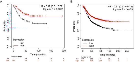 - Fekete, J.T.; Győrffy, B. ROCplot.org: Validating predictive biomarkers of chemotherapy/hormonal therapy/anti-HER2 therapy using transcriptomic data of 3,104 breast cancer patients. Int. J. Cancer 2019, 145, 3140–3151. [Google Scholar] [CrossRef] [PubMed]