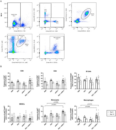 To assess the changes occurring in the immune cell populations as a result of FEC + oHSV-1 therapy, we performed flow cytometry analysis (Figure 4). The mice were treated with PBS, FEC, oHSV-1, or FEC + oHSV-1, and blood was collected 9 and 13 days after the start of treatment. While there were no significant changes in T cells, B cells, or MDSCs, FEC + oHSV-1 therapy significantly increased the amount of circulating inflammatory monocytes (CD11b+Ly6ChiLy6G- cells) and macrophages (F4/80+ cells) on both days 9 and 13 (Figure 4).