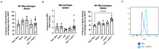 While classical myelopoiesis occurs in the bone marrow, recent data suggest that the spleen is a prominent site of extramedullary hematopoiesis (EMH) in cancer [31]. For this reason, we decided to look into the spleen of tumor-bearing mice treated with PBS, FEC, oHSV-1, or FEC + oHSV-1. Interestingly, while we found that the level of M1-like macrophages did not change in the peripheral blood (Figure 5A) and that the overall frequency of macrophages was not significantly changed across treatment groups in the spleen, the macrophages isolated from the spleens of the mice treated with FEC + oHSV-1 expressed iNOS, suggesting an M1-like phenotype (Figure 5B,C). This further supports the role of FEC + oHSV-1 therapy in polarizing macrophages to an inflammatory phenotype.