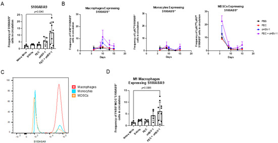 Mice bearing E0771 subcutaneous tumors were treated with PBS, FEC, oHSV-1, or FEC + oHSV-1, and flow cytometry analysis was performed on the peripheral blood 6, 9, 10, 13, and 15 days after the start of treatment. FEC + oHSV-1 therapy increased levels of S100A8/A9 in the peripheral blood (Figure 6A). Furthermore, the expression was predominantly localized to the F4/80+ macrophages, peaking on day 10 Figure 6B,C and Figure S2). Interestingly, when we looked at the expression of S100A8/A9 on the M1-like macrophages (CD11b + F4/80 + iNOS + S100A8/A9 + cells), we saw an increase in this population with FEC + oHSV-1 therapy (Figure 6D). These findings are in line with the RNA transcriptome profile, further indicating the importance of macrophages in shifting myeloid cell differentiation.