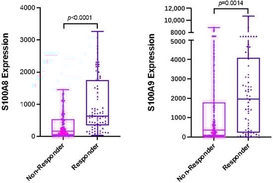 S100A8 and S100A9 are independent predictors of response to FEC therapy in breast cancer patients. S100A8 and S100A9 mRNA expression was compared between responders (n = 84) versus non-responders (n = 219) to FEC treatment in a cohort of all breast cancer patients (S100A8: AUC = 0.71, p < 0.0001; S100A9: AUC = 0.626, p = 0.0014). Response defined as complete pathological response versus residual disease after completing therapy.
