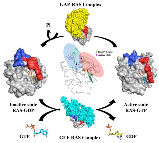 RAS cycles between ‘inactive’ state bound to GDP and ‘active’ state bound to GTP. RAS acts as a guanosine diphosphate (GDP)-inactive molecular switch in resting cells and becomes activated in response to extracellular receptors by binding guanosine triphosphate (GTP), as catalyzed by the guanine nucleotide exchange factor (GEF). The GTPase-activating protein (GAP) stops the Ras signaling by switching Ras into an inactive GDP-bound signaling state. PDB IDs: 7C40 (RAS-GDP), 6Q21 (RAS-GTP), 1WQ1 (GAP-RAS), and 4G0N (GEF-RAS).