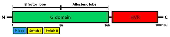 RAS has three domains (Figure 3). RAS isoforms share G-domain that highly sequences homology (90%). The G-domain (residues 1–166) consists of an effector lobe (residues 1–86) and an allosteric lobe (87–166). This domain is composed of the six beta-strands and is surrounded by five alpha-helices [9]. KRAS has hypervariable regions (HVRs) present in the C-terminal element. The HVRs region undergoes a post-translational modification (PTM), including by farnesylation, palmitoylation, methylation, phosphorylation, nitrosylation, and ubiquitination [10]. Particularly, the carboxyl terminal PTMs are related to affinity for membrane and trafficking with cellular compartments. According to research, palmitoylated HRAS is located in the plasma membrane, but depalmitoylated HRAS is accumulated in the ER and Golgi [11]. The HVRs play a role in anchoring RAS to the membrane, which displays among Ras proteins less than 15% of sequence homology [12]. The effector lobe mainly interacts with RAS effectors such as rapidly accelerated fibrosarcoma (RAF), PI3K, and RalGEF. The allosteric lobe plays a role in intra-protein communication, which connects the effector lobe to membrane-interacting residues [13,14]. The effector lobe is divided into two switch regions, switch-I (residues 30–38) and switch-II (residues 59–76), controlling the specificity of the binding to effector molecule and affecting interaction of transducer to cellular downstream [2,7]. Different from the Ras protein, the effector lobe of KRAS additionally has P-loop-phosphate binding loops (residues 10–16 and 56–59), which indicate a GTP-binding pocket. These play a role in interacting with the b-phosphate and c-phosphate of GTP [2]. Moreover, residues 116–119 and 152–165 interact with the guanine base. In the case of binding of GTP with P-loop-phosphate, GTP temporarily binds to Ras protein. Additionally, KRAS protein has a CAXX motif, which is related to plasma membrane localization. The KRAS protein should localize plasma membrane to regulate signal transduction. For the plasma membrane localization, KRAS protein is needed for farnesylation in the cysteine residue of CAXX (C represents cysteine, A is an aliphatic amino acid, and X is any amino acid) motif [15,16]. After farnesylation of cysteine residues in the CAXX, the AXX amino acid is cleaved by protease, followed by the methylation the free carboxyl group of the cysteine, and these events occur on the cytosolic surface of the endoplasmic reticulum [16]. Additionally, in the case of the splice variant KRAS4A, the AXX motif is palmitoylated by palmitoyl transferase and targeted to the membrane. However, in the case of the splice variant KRAS4B, it is speculated that membrane localization occurs through a microtubule-dependent mechanism [17].