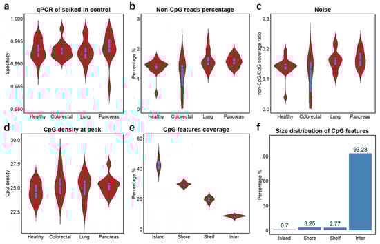 To study the clinical feasibility of cfMBD-seq, we retrospectively profiled the cfDNA methylome of 53 blood samples from patients with metastatic carcinoma of the colon/rectum, lung, and pancreas, and from cancer-free individuals. We quantified cfDNA concentrations from plasma samples and showed that cancer patients had higher cfDNA yields than non-cancer controls (Figure S1a, Table S3). To investigate the methylation capture efficiency of cfMBD-seq, we compared spiked-in controls between methylated and unmethylated A. thaliana DNA in the capture reaction and observed a median specificity of 99.3% (99.16% (Q1)–99.43% (Q3)) across all samples (Figure 2a). Based on the sequencing data, we filtered out duplicate reads and reads with low alignment scores from total sequence reads (41.62 (38.75–44.43) million) and obtained 35.33 (32.77–37.37) million high-quality reads (Figure S1b). We then investigated genome-wide methylation enrichment and found that the number of captured fragments without any CpG tandem accounted for only 1.47% (1.33%–1.59%) of high-quality reads (Figure 2b). The average coverage ratio of fragments without any CpG tandem to fragments with at least one CpG, known as noise, was 0.15 (0.13–0.17) (Figure 2c). The median CpG density of fragments with the highest read coverage was 25.2 (24.2–25.7) (Figure 2d), corresponding to high CpG density regions—CpG islands. Intrigued by the high sequencing coverage on CpG islands, we further studied the distribution of sequence reads by calculating the percentage of normalized reads on different CpG annotation features (i.e., CpG islands, CpG shores, CpG shelves, and inter-CpG regions). We found a median of 42.16% (39.47–45.15) of reads mapped to CpG islands, whereas CpG islands only accounted for 0.7% of the hg19 reference genome (Figure 2e,f and Figure S1c). Since methylation alterations may occur a short distance away from the CpG islands [35], we also calculated the sum of reads mapped to extended CpG islands (i.e., CpG islands, CpG shores, and CpG shelves). A median of 91.46% (90.89%–92.13%) of reads were mapped to the extended CpG islands, which accounts for only 6.72% of the reference genome (Figure 2e,f and Figure S1d). These results demonstrate that most of the sequence reads captured by cfMBD-seq were significantly enriched on CpG island-centered regions, illustrating successful cfMBD-seq methylation enrichment and library construction across all samples.