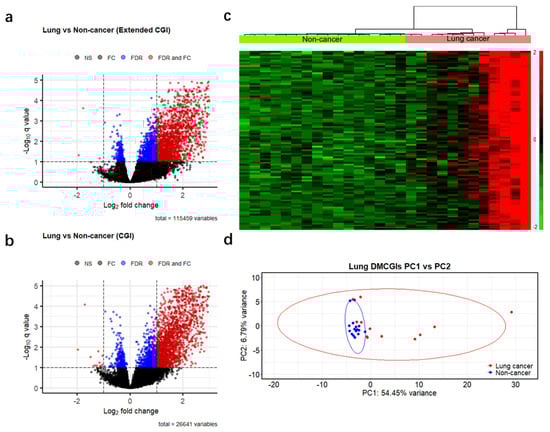 Differentially methylated regions between cases and controls detected by cfMBD-seq. (a) Volcano plots of differentially methylated regions (DMRs) at extended CpG islands (CGI) (i.e., CpG islands, CpG shores, and CpG shelves) between lung cancer patients (N = 12) and non-cancer controls (N = 16). Black dots indicate non-significant regions. Blue and red dots indicate statistical significance at a Benjamini–Hochberg false discovery rate (FDR) < 0.1 (negative binomial model, Wald test). Red dots also indicate regions with absolute fold change (FC) >2. (b) Volcano plots of DMRs at CpG islands between lung cancer patients and non-cancer controls. (c) Unsupervised hierarchical clustering (z-score normalization of DESeq2-normalized counts, Euclidean distance, and Ward Clustering) of the top 100 differentially hypermethylated CpG islands between lung cancer patients and non-cancer controls. (d) Principal component (PC) analysis using DESeq2-normalized counts of the top 1000 differentially hypermethylated CpG islands between lung cancer patients and non-cancer controls.
