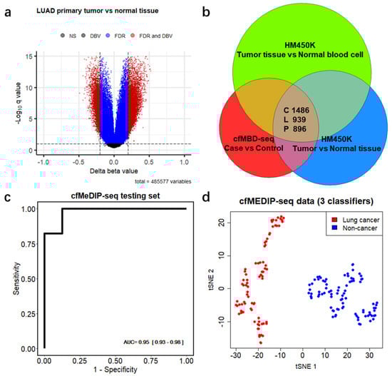 Differentially methylated CpG islands are mainly driven by tumor-specific DNA methylation patterns. (a) Volcano plots of differentially methylated CpG sites between lung adenocarcinoma (LUAD) primary tumors and matched adjacent normal tissues from 21 patients from Infinium HumanMethylation450 BeadChip (HM450K) data. Black dots indicate non-significant regions. Blue and red dots indicate regions significant at Benjamini–Hochberg false discovery rates (FDR) < 0.1 (F-test). Red dots also indicate regions with mean of Δ beta values (DBV) >0.2. (b) Venn diagram showing the number of overlapping regions between plasma-derived differentially hypermethylated CpG islands (DMCGIs) from cfMBD-seq and tissue-derived DMCGIs from HM450K in three cancer types (i.e., C, colorectal cancer; L, lung cancer; P, pancreatic cancer). (c) Predictive modeling using LASSO regularized logistic regression case-versus-control models on the cfMeDIP-seq cohort including lung cancer patients (N = 80) and non-cancer controls (N = 86). ROC curve for 20% of held-out testing set is shown. AUC values represent the median and interquartile ranges for 100 repeats of the model. (d) t-distributed stochastic neighbor embedding (t-sne) plot using 3 classifiers (chr1:243646395-243646888, chr8:99985734-99986983, and chr21:38068194-38073891) identified from the training set for the plasma samples of the entire cfMeDIP-seq cohort (N = 166).