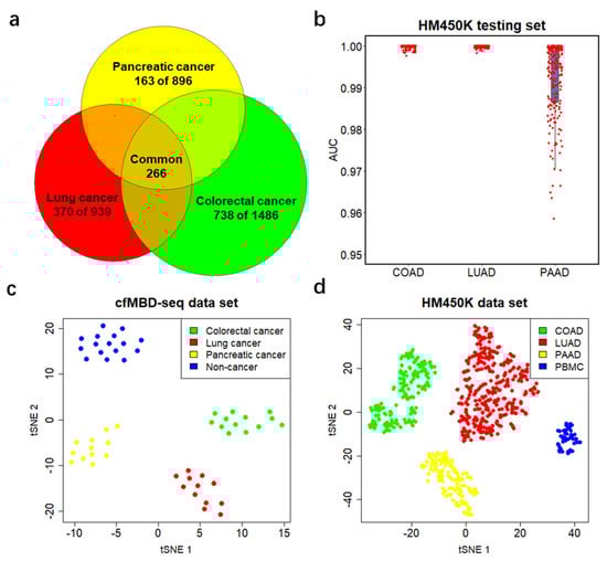 To further investigate the candidate DMCGIs shared between cfDNA and tumor tissue, we intersected the three sets of selected DMCGIs for colorectal (N = 1486), lung (N = 939), and pancreatic (N = 896) cancer. We identified a total of 1271 cancer-type-specific DMCGIs, including 738 for colorectal cancer, 370 for lung cancer, and 163 for pancreatic cancer. Furthermore, a total of 266 DMCGIs were shared by these three cancer types (Figure 5a). To rigorously evaluate the performance of these cancer-type-specific DMCGIs in cancer classification, we acquired an additional independent TCGA HM450K data cohort, including primary tumors for COAD (N = 210), LUAD (N = 385), and PAAD (N = 162) (Figure S6a). To convert HM450K data to CpG-island-based beta values, we filtered out CpG sites that were not annotated to CpG islands from 485,577 HM450K loci and used the remaining 309,465 CpG sites for subsequent analysis. Given the methylation level between neighboring CpG sites are positively correlated, we calculated the mean beta values of CpG sites annotated to the same CpG island and generated a beta value matrix for all CpG islands. We then performed similar machine learning analyses on the HM450K cohort using the top 100 cancer-type-specific DMCGIs. The analyses consisted of a 4:1 sample partition, LASSO regularization, and logistic regression modeling. Rather than a case-versus-control model, here we built a one-versus-all-others model for each cancer type. After 100 repeats of the training process, we identified three colorectal, 16 lung, six pancreatic specific DMCGIs (non-zero coefficients) as classifiers. Again, we fit the predictive model on the held-out testing set and applied ROC statistics for evaluation. The results showed great performance in the prediction of cancer type (median AUC = 1 for COAD, 1 for LUAD, and 0.989 for PAAD) (Figure 5b). The methylation levels of cancer classifiers in its specific cancer type are higher than those of other cancer types (Figure S6b). To better visualize the classification performance, we generated the t-sne plot using these classifiers and observed clear separation by tumor type in the cfMBD-seq plasma cohort (Figure 5c). This separation was notably reproduced in the HM450K cohort of 757 cancer tissue and 61 blood cell samples (Figure 5d). These results indicate the robust ability of cfMBD-seq to recover tumor-tissue-derived methylation profiles in cfDNA across a range of cancer types and to enable cancer type classification.