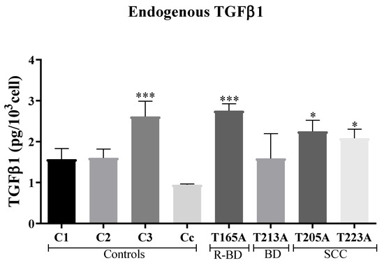 To evaluate the production of TGFβ1 by cells in culture, the Quantikine® ELISA Human TGFβ1 Immunoassay (R&D Systems, Minneapolis, MN, USA) kit was used. To obtain the samples, cells were seeded in 24-well plates. When they reached 80% confluence, medium was switched to 250 µL of phenol red-free DMEM (Thermo Fisher Scientific Inc., HyClone, Rockford, IL, USA) supplemented with 1% FBS and 1% antibiotics. After 24 h, supernatants were harvested, centrifuged at 480 g for 5 min and were stored at −20 °C until ulterior analyses. Before performing the quantification assay, latent TGFβ1 present in the supernatants was activated for its detection by incubating the samples with 1 M of hydrochloric acid, followed by neutralization by adding a solution containing 1.2 M of sodium hydroxide and 0.5 M of HEPES. In parallel, cells remaining in the wells were counted using a TC20TM automated cell counter (BioRad) to normalize the TGFβ1 measurements.