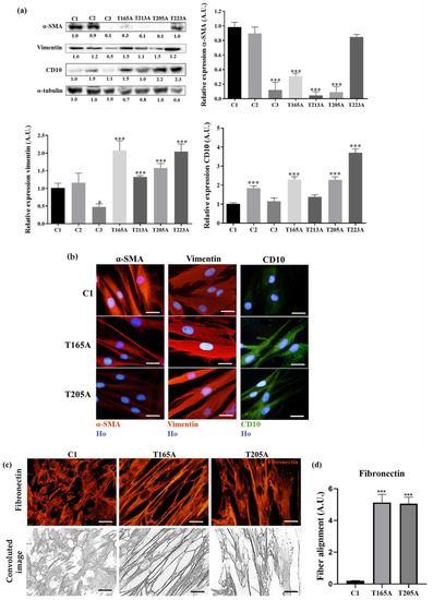 24], pointing out that its expression levels can show a wide variation in activated fibroblasts that still behave as CAFs. Related to the other markers, the results obtained along the characterization were consistent, since the overexpression of vimentin and CD10 and the parallel alignment of fibronectin fibers are all well-known features of CAFs [