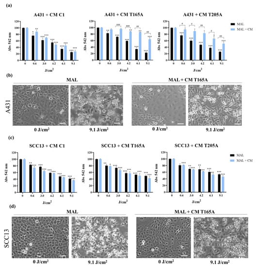 For the administration of PDT, 10 mM of stock Methyl-aminolevulinate (MAL) (Sigma-Aldrich) was prepared in deionized sterile water. SCC cells were seeded and grown in culture conditions up to 60–70% confluence. Then, cells were incubated with 0.5 mM MAL for 5 h in DMEM culture medium without FBS and subsequently irradiated with red light doses ranging between 0.6 and 12.2 J/cm