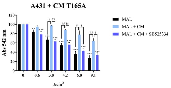 22], our study addresses this question for the first time in regard to PDT. Our findings indicate that CAFs can mediate resistance to PDT in cSCC. Furthermore, this resistance was necessarily induced by secreted factors, given that our experimental approach was restricted to the use of CAF-derived CM. Interestingly, the resistance to PDT was only observed in the A431 cell line, but not in SCC13. Based on previous literature [