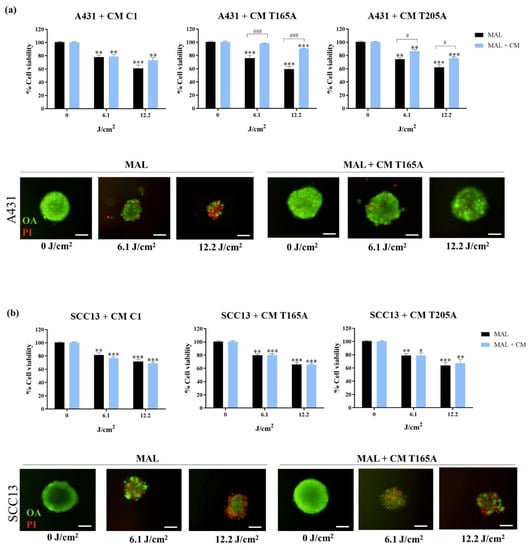 In the case of spheroids, they were preincubated with CM for 48 h and subsequently exposed to MAL-PDT. The toxicity of MAL-PDT was determined 24 h after irradiation by propidium iodide-orange acridine assay (PI/OA). The PI red signal served to estimate the % of cells that had lost membrane integrity (dead cells) over the total number of cells forming the spheroid (both alive and dead, all of them stained in green with OA). The fluorescent signal of the compounds was observed using the fluorescence microscope with blue light irradiation (450–490 nm, BP 490 filter) for OA and green light irradiation (570–590 nm, DM 590 filter) for PI. The images obtained were analysed using Image J and represented as an estimation of cell survival rates.