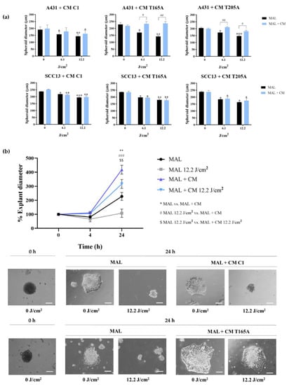 For PDT resistance studies, A431 and SCC13 cell lines were seeded as described. Then, 24 h after seeding, culture medium was removed, and cells were incubated during 48 h prior to PDT with CM or fresh culture medium containing exogenous TGFβ1, or DMEM with 1% FBS and 1% antibiotics for MAL-PDT. In the case of CM and exogenous TGFβ1 treatments, the concentration of FBS was maintained at 1% throughout the administration of PDT to avoid interferences with the TGFβ1 present in it. Following the pre-treatment, PDT was administered by incubating the cells for 5 h with 0.5 mM of MAL diluted in the corresponding media and subsequently irradiating with the red light doses indicated above. After PDT, the medium was removed and the corresponding media were added to each condition.